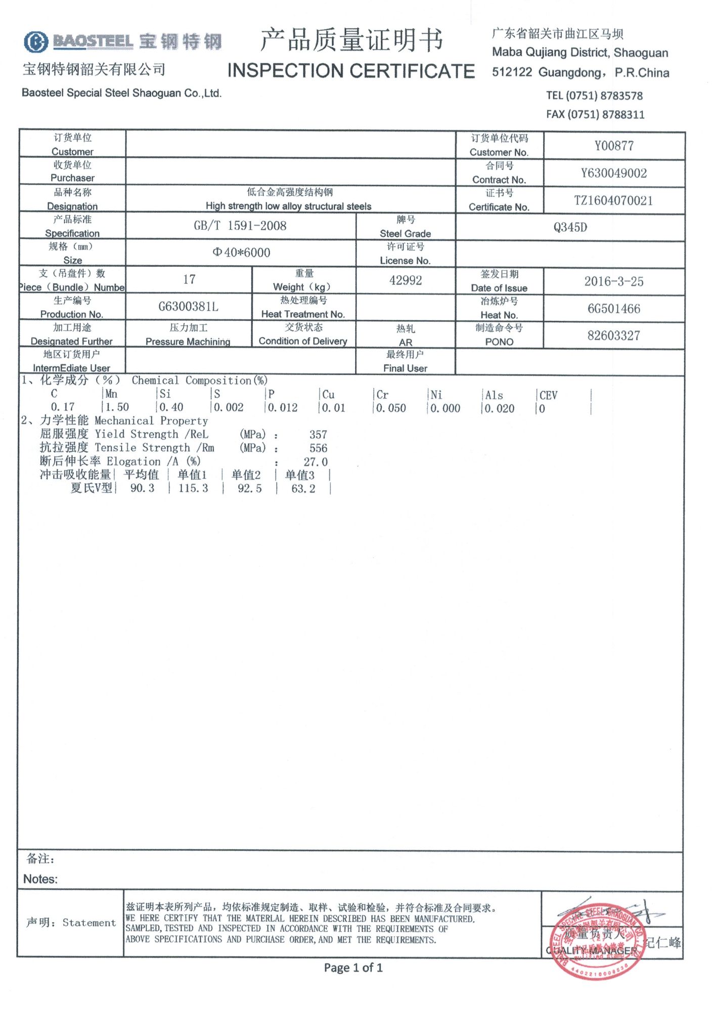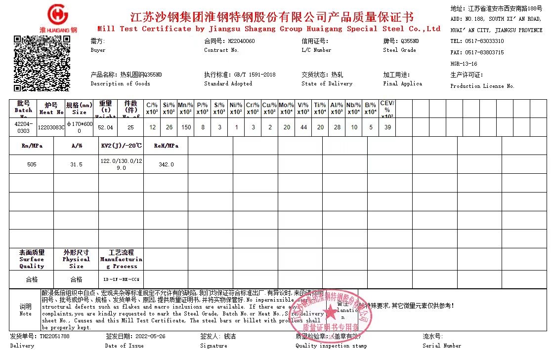 一、淮鋼Q355D圓鋼產(chǎn)品質(zhì)量證明書