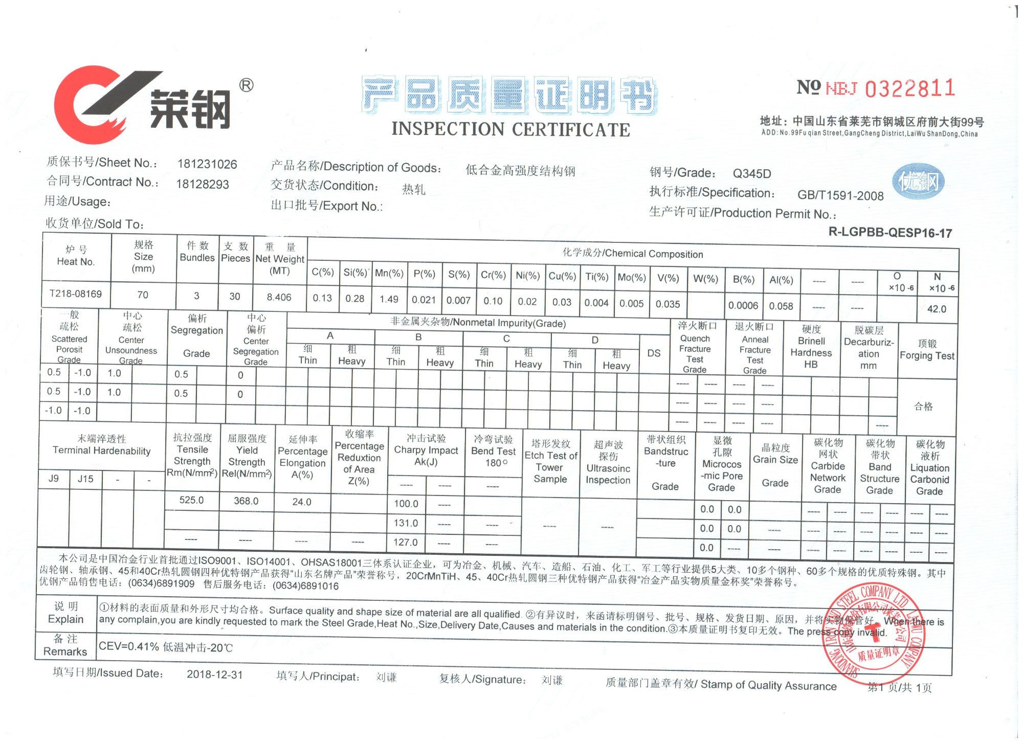 二、萊鋼Q355D圓鋼產(chǎn)品質(zhì)量證明書