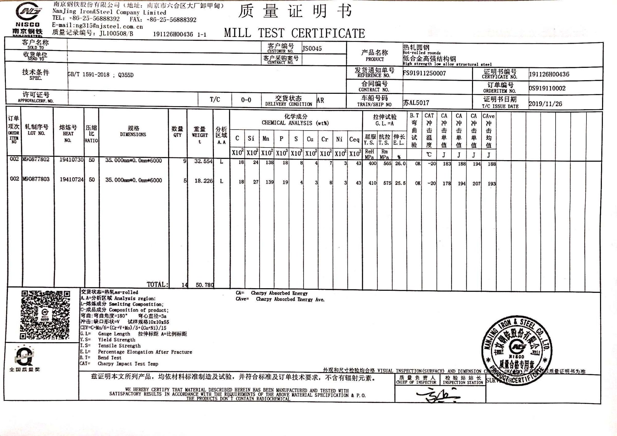 三、南鋼Q355D圓鋼產(chǎn)品質(zhì)量證明書