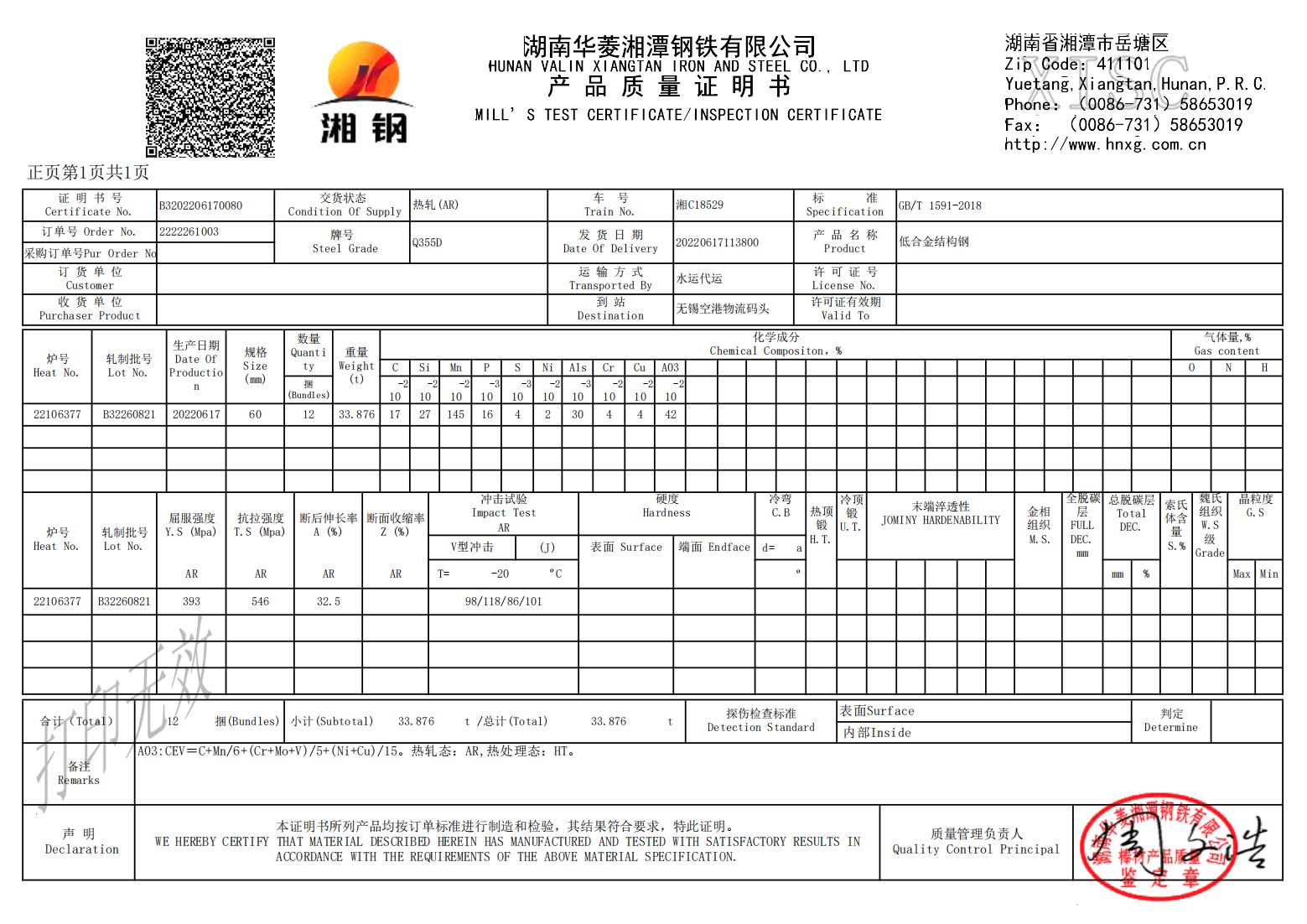 五、湘鋼Q355D圓鋼產(chǎn)品質(zhì)量證明書